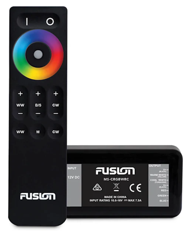1. Wireless Convenience Operate your RGBW lighting system without the need for direct wiring, offering freedom of placement and effortless adjustments from anywhere on your vessel. 2. Full Color Control Easily select from millions of colors or customize your own, creating the perfect mood lighting for your marine environment. 3. Adjustable Brightness & Modes Control brightness levels and switch between pre-programmed lighting modes for dynamic or ambient effects with a simple touch. 4. Compact and Ergonomic Design Lightweight and user-friendly, this remote fits comfortably in your hand, with intuitive buttons for quick and precise adjustments. 5. Reliable Wireless Range Equipped with advanced wireless technology, ensuring stable and responsive control even at a distance from the lighting system. 6. Easy Integration Designed to work seamlessly with compatible RGBW LED marine lighting systems, allowing plug-and-play setup with minimal effort. Fusion CRGBW Wireless Remote - Key Features1. Full RGBW Spectrum Offers complete access to RGBW colors for dynamic, vibrant lighting on your vessel. 2. Wireless Operation Control lights without cables, providing flexibility and convenience on deck or cabin areas. 3. Customizable Lighting Modes Switch between preset modes or create personalized effects for the perfect ambiance. 4. Adjustable Brightness Levels Dim or brighten your LEDs to suit the environment or time of day. 5. Compact & Ergonomic Designed for comfort and easy one-handed use while navigating your boat. 6. Reliable Signal Range Advanced wireless technology ensures stable performance and responsive control across your vessel. 7. Easy System Integration Plug-and-play compatibility with supported marine RGBW LED lighting systems for a hassle-free setup. Fusion CRGBW Wireless Remote – What is In The BOX: